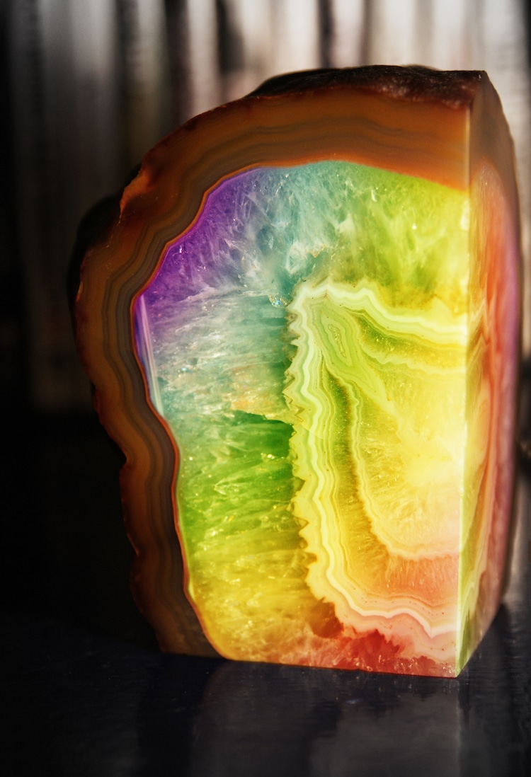 虽然大部分水晶的色泽都是天然形成的,但是彩虹水晶并非如此。要达到这般惊艳的效果,人们必须利用金属镀层流程对水晶进行加工,也就是让仔细研磨过后的金属——比如钛——覆盖天然水晶表面,这样才能让水晶拥有彩虹的光泽。一般要几百万年才能形成天然的彩虹水晶,这个制作流程则快多了,只需将水晶在高温真空箱放置几小时,让金属与水晶表面融合即可。
