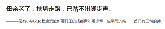 背井离乡后,乡愁是一棵没有年轮的树,永不老去,故乡不老,唯有父母健在。在对游子的期盼和等待中,他们默默地衰老,无声无息,就好像有一天,我忽然发现,母亲扶墙走路时,已踏不出声响。