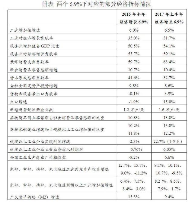 2015年全年和2017年上半年,我国国内生产总值(GDP)增长均为6.9%。两个6.9%都产生于经济新常态背景下,经济运行都处在合理区间内,但两个数据分别形成于“十二五”收官之年与供给侧结构性改革深化之年,发展条件和运行态势有所异同。前者是经济持续下行过程中市场预期较为悲观条件下形成的,更多反映出经济周期性回落、调速不失势;后者是经济企稳回升过程中市场信心增强条件下形成的,更多体现为经济恢复性反弹、量增质更优。总的来看,增速相同但形似神离,对应的经济结构和质量效益均存在差异,增长内涵不完全一样,当前这个6.9%的含金量更高。