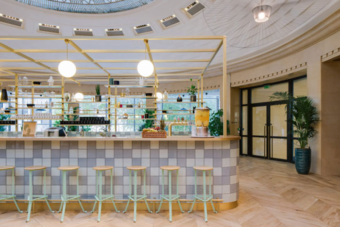 这个设计中,运用了很多不同的建筑材料,这也让这个空间变得更加丰富。例如,大理石台面、木质桌椅包裹金属镶边、充满趣味的马赛克瓷砖以及不同色彩的天鹅绒质地的沙发和抱枕等。