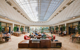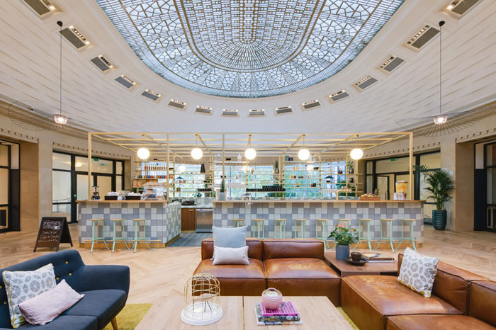 就在几日前,WeWork 在法国的第一个联合办公空间终于揭开神秘面纱,它位于巴黎 La Fayette 的一栋始建于 1920 年的老建筑内,距离第九区的圣拉扎尔车站仅隔着一个街区。敞亮又华丽的玻璃穹顶,丰富的金属饰面,彰显出强烈的装饰主义风格,非常吸引眼球。