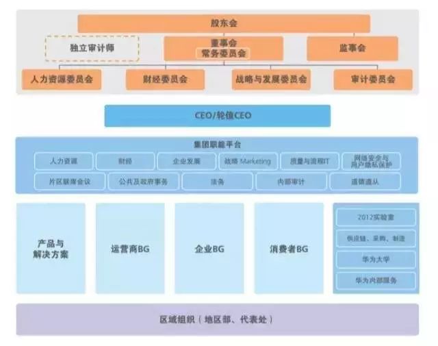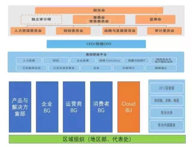 华为的事业理论在其基本法里已经非常明确,在此基础上确定其能够承担组织实现使命和愿景的组织结构,将是顶层设计得以落地的最重要的环节。