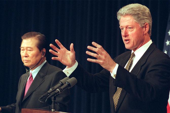 卡明斯:1971年,金大中首次参加总统大选就获得了540万张选票,几乎将舞弊谋求连任的朴正熙拉下马。他在很长一段时间都是持异见者,而克林顿也曾抗议过越南战争,所以两位总统有共同点,他们都理解抗议者和持异见者。但是民主化运动和阳光政策没有什么关系。1945年,韩国各地散布着很多民众组织的“建国准备委员会”,很多委员会成员并非共产主义者,只是关心国家独立,金大中也是其中的一员,这段经历让他更加深入地了解韩国和朝鲜的关系。在1945年到1998年的这段漫长的时间里,他研究和思考了朝鲜问题,写过一些以朝韩分裂为主题的文章。而他的上台和阳光政策的推行,正是经验遇上了时机。他也真正推动了克林顿总统采取阳光政策。