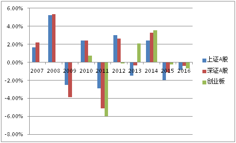 而从过去10年的历史数据来看,上证指数和深圳成指表现一致,涨跌年份均为5年;而创业板7年间(2010年才设立创业板指数)有3年实现上涨,另外4年则为下跌(统计结果来自国庆节前5个交易日的数据)。