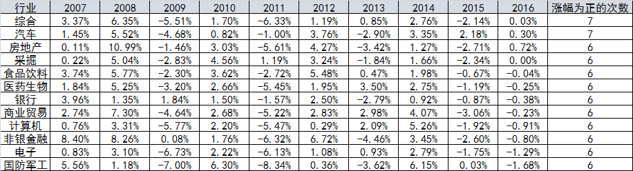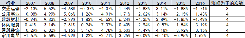 反观交通运输、家用电器、建筑装饰、休闲服务、建筑材料以及公用事业这6个行业似乎并不受投资者的待见,过去10年中涨幅为正的年份均不足5年,其中交通运输板块甚至只有3年涨幅为正,其他5个板块涨幅为正的年份均为4年。