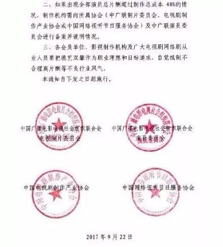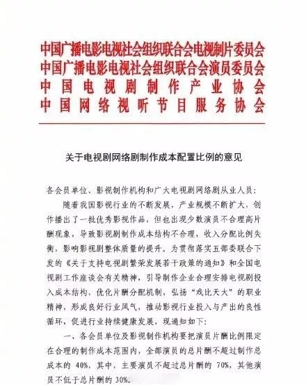 短短半月前,国家五部委发布了一则《关于支持电视剧繁荣发展若干政策的通知》,严禁播出机构以明星为唯一议价标准。《通知》第三条规定为:严禁播出机构以明星为唯一议价标准;行业组织出台电视剧成本配置比例指导意见,优化片酬分配机制。