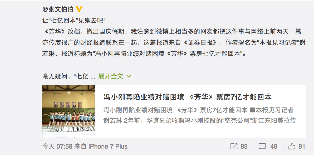 而前天《证券日报》一篇题为《冯小刚再陷业绩对赌困境 ,<芳华>票房7亿才能回本》的报道,则不禁让人将该片撤档与国庆档激烈的竞争对其票房造成的巨大压力联系在一起。在《芳华》正式宣布撤档仅仅几个小时之后,该片负责宣发的伯乐营销CEO张文伯也发出题为《让“七亿回本”见鬼去吧!》的长文,对前文进行了驳斥,并称该片也并非是因预售成绩低而选择“逃跑”。