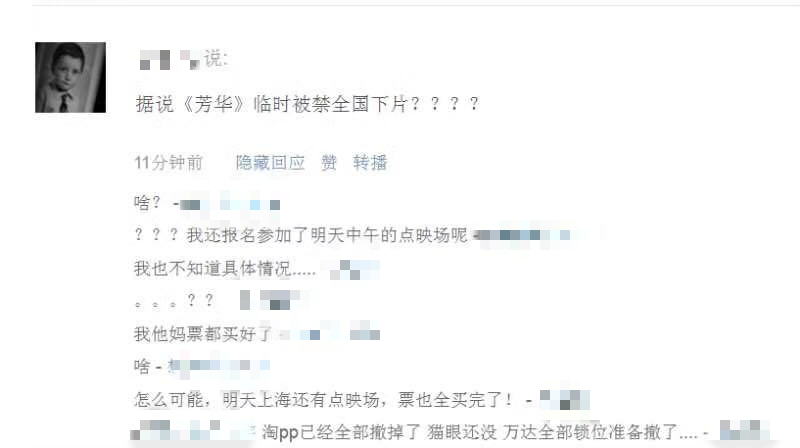 此时已有媒体称,各家院线和售票网站已经陆续接到通知,暂停《芳华》的排片,已经排片的全部锁场停止售票,未售出场次全部取消。23点左右猫眼电影上《芳华》预售场次也逐渐减少,并最终由预售变为了不确定上映时间的想看,院线暂停排片的消息被坐实。之后尽管猫眼专业版显示《芳华》的排片不降反升,但这似乎只是后台出现的bug,临近24点猫眼猫眼专业版显示,芳华上映首日排片仅剩0.7%