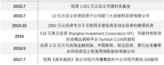 七匹狼先后参与设立了七匹狼集团财务公司、华旖时尚基金、厦门七尚股权投资有限公司,并投资欧洲时尚精品购物平台Farfetch,收购《周末画报》母公司现代传播集团的子公司现代数码30%股份等,意图在时尚消费投资领域大展拳脚。