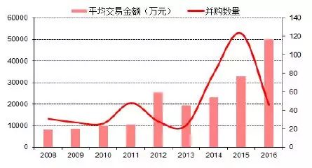 2016年并购数量出现回落,但平均交易金额继续触碰新高,这说明随着行业的发展,公司的并购行为更加成熟,单笔大规模并购将成为趋势。
