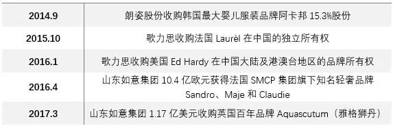 服饰作为消费品,普遍存在品牌老化的问题,随着既有客群的老去,他们迫切需要创建或者引入新的品牌来满足新一代消费人群的需求。不过, 随着行业中越来越多企业登陆资本市场,资本实力增强的环境下,中国纺织服装在经历了2011-2013年的行业低迷期之后,近几年迎来一轮新的并购潮。