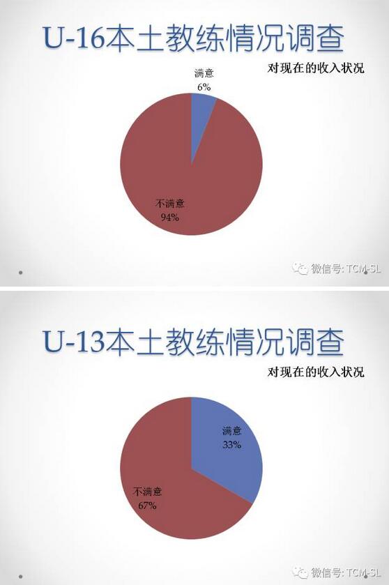 对于现在的收入状况,17名作答的U-16教练中,16人表示不满意,达到了94%;而11名作答的U-13教练中,表示不满意的为8人,不满意比例下降;