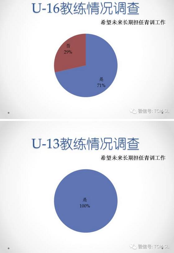 而在“希望未来长期担任青训工作”的回答中,21名U-16教练只有71%选择“是”;15名U-13的教练则全部选择“是”。