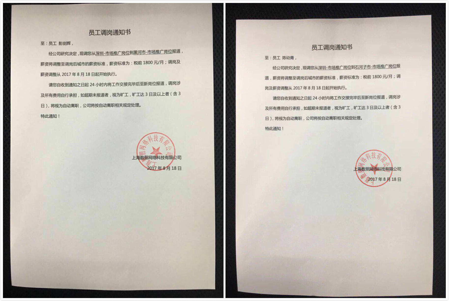 据界面创业记者了解,收到了类似调岗通知书的员工主要来自于深圳、武汉、南京等南方城市。根据调岗通知书,有的Hi电员工被从武汉调至云南省红河哈尼族彝族自治州,有的被从南京调至内蒙古乌海市,有的被从深圳调至新疆石河子市或者黑龙江的黑河市。而这些调岗的目的地都是边境省份的边境城市,Hi电在当地并无实际业务。