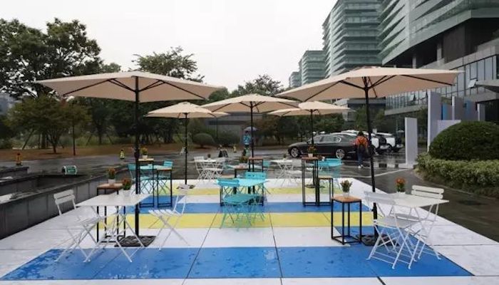 针对海创园规划展览馆门前空置广场,改造前这片区域原本规划为大客车停车位,仅用于停车,但平时又多处于空置状态,没有充分利用空间。