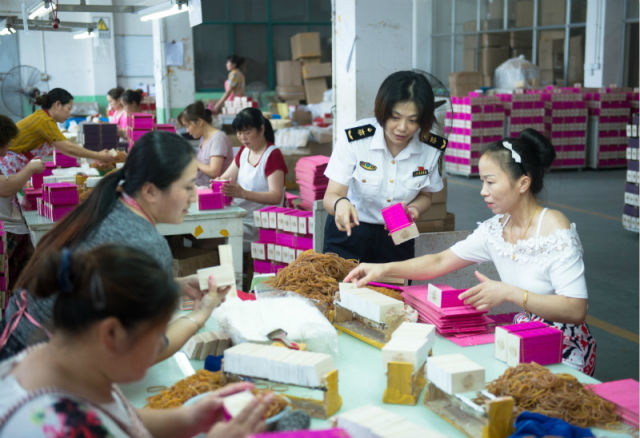 江湖州检验检疫局动植物卫检处工作人员在浙江峰晖竹木草制品有限公司检验竹制包装盒(7月11日摄)。新华社记者 翁忻旸 摄