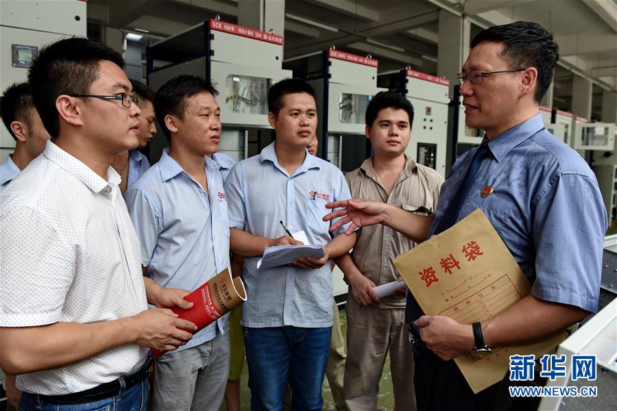 福州市仓山区检察院工作人员(右一)在辖区企业向管理人员宣讲法律法规(2016年8月8日摄)。新华社记者 张国俊 摄