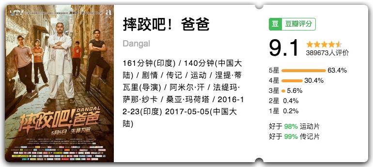 今年豆瓣评分最好的院线片,印度电影继《三傻》后再次在国内横扫口碑。男神阿米尔·汗已然成为好片代言人。