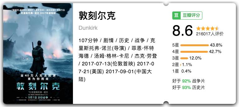 诺兰2017新片,通过三线叙事讲述一个二战故事,片中海量英伦小鲜肉出演,比电影本身还要赏心悦目。