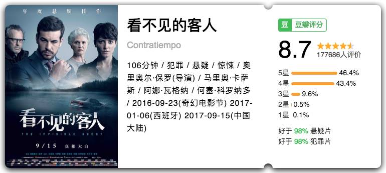 西班牙口碑悬疑片进军国内市场,国内刚刚上映不久,导演也来华亲自宣传,8.7高分的口碑,还没看的话赶紧去影院感受一下这个反转神剧情。