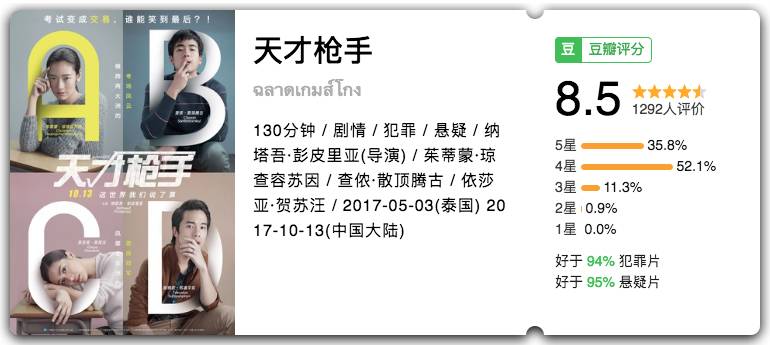 泰国今年票房冠军作品,国内即将于10月13日上映,这也是院线片里唯一一部尚未上映的影片。讲述考试作弊的故事,很新鲜的题材,绝对值得期待。