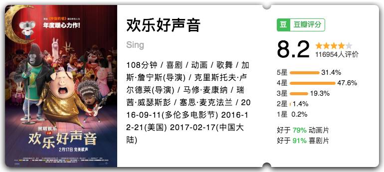 一部笑中带泪的合家欢动画,角色各个出彩,歌也都很好听,继《疯狂动物城》后又一部口碑票房大赚的动物电影。
