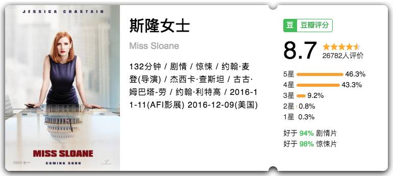 劳模姐杰西卡·查斯坦又风险了影后级表演,加上扎实的处女作剧本,这部电影在豆瓣获得8.6高分真是实至名归。
