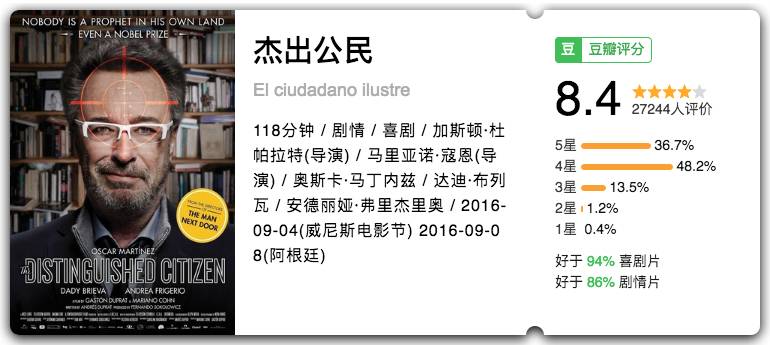 荒诞不经,意犹未尽。阿根廷继《荒蛮故事》后又一部黑色幽默力作。家国、故土、邻里、亲友关系交织在这一出讽刺戏,威尼斯电影节影帝作品。