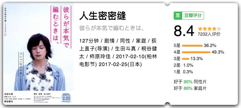 “当你真正迷上一个人,其他什么都不重要了” 生活JI JI大,人生咪咪缝。可能是年度最佳日影,选取LGBT题材,生田斗真男扮女装圈粉无数。