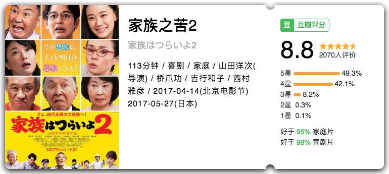 喜欢第一部就喜欢第二部,因为情感核心没变;喜欢这家子人就会喜欢里面的每一个人,各有故事却能苦中作乐;喜欢山田洋次,喜欢妻夫木聪,喜欢日本家庭片,都会喜欢这一部,哪怕只是一部续集。