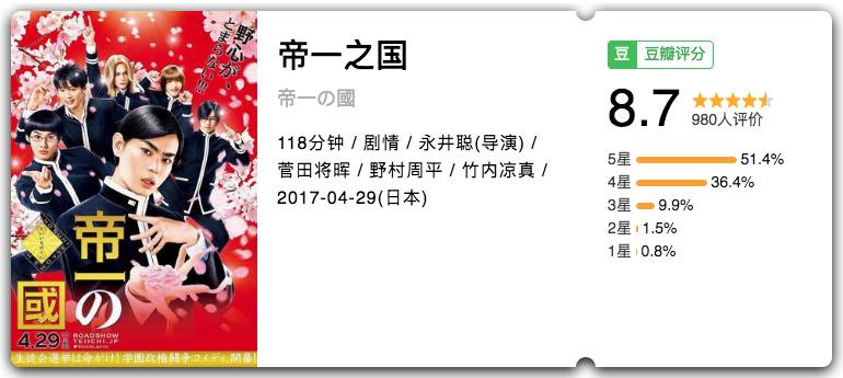 古屋兎丸人气漫画改编,永井聪导演,菅田将晖主演。故事围绕着“目标成为内阁总理大臣的帝一”展开,看苏打的颜艺就是开心,中二又逗比,好笑又好看。