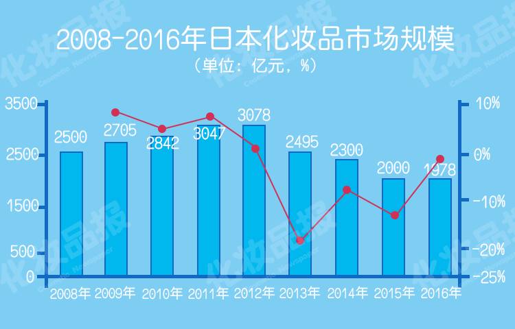 最新数据显示,2016年,日本化妆品市场规模已由2012年的3078亿元萎缩至1978亿元。