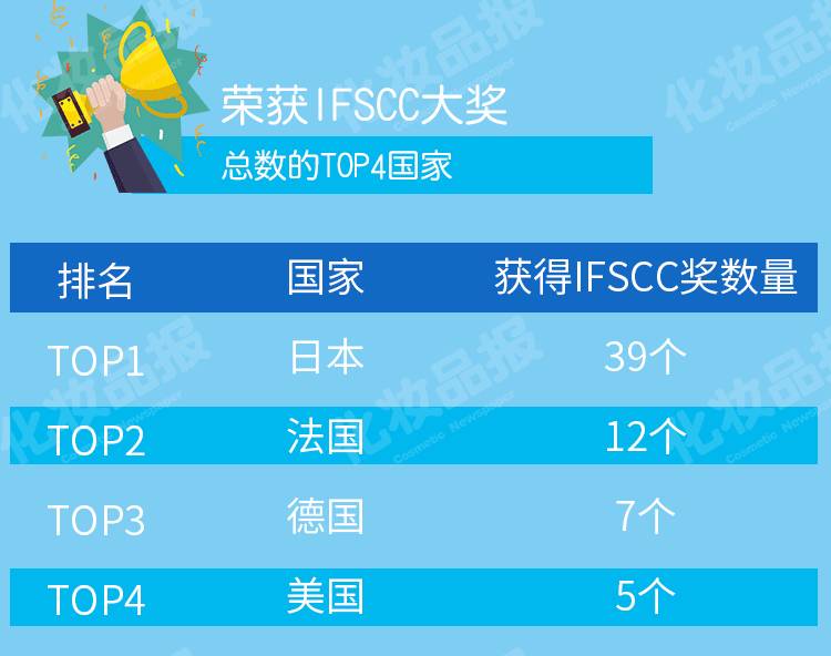 同时,杨建中向《化妆品报》记者展示了一组数据,从1970年开始,在被称为全球化妆品界科研领域最权威的IFSCC大奖评选中,包括资生堂集团、高丝集团等在内的日本化妆品公司已经拿下39个IFSCC大奖,位居全球第一,而法国仅12个,德国仅7个,美国则不足5个。