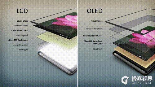 传统的 LCD 显示屏,底下通常需要一块背光层以供照亮整个显示区域。相比之下,OLED 屏幕每个像素点可独立发光,少了背光层的加入,产品厚度自然更容易做薄。