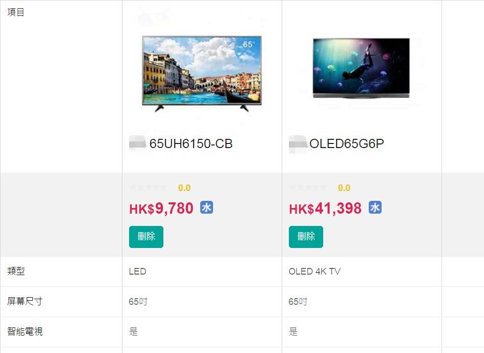 ▲同个品牌,同个规格下,LED 与 OLED 电视价格(来源:Price.hk)