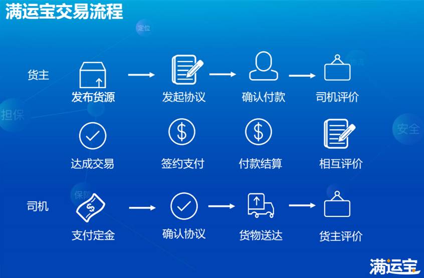 ① 一种“第三方保障式”的交易模式。谭远江介绍,满运宝为货主和司机提供双向保障,平台提供的是第三方交易保障职能。具体流程是: