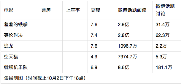 电影票房上座率豆瓣微博话题阅读微博话题讨论羞羞的铁拳4.41亿45.2%7.62.9亿31.4万英伦对决1.84亿21.2%7.42.8亿62.3万追龙1.29亿35.4%7.61096.7万2.2万空天猎1.04亿28.5%4.97974.7万5.3万缝纫机乐队9609.6万34.3%6.98.6亿181.1万读娱制图(时间截止10月2日下午19点50,票房上座率数据来自淘票票专业版)