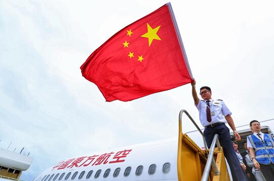 东航包机机组人员挥舞着国旗,欢迎同胞回家。
