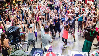 等瑜伽和简单的用餐结束,瑜伽教室被完全的转变成一个派对现场,也有更多的人涌入。参加派对的人们互不认识,这些人中有精心打扮的,还有穿着瑜伽服,也有打扮成茄子或者动画人物的穿着各种奇异服装的人们。在两个小时的舞蹈派对中,大家随着音乐起舞,其疯狂、投入和热闹的程度也完全不输给那些深夜派对。