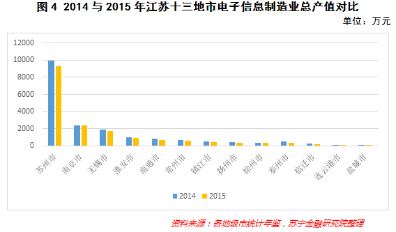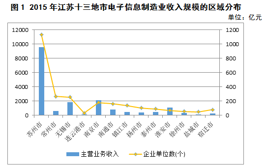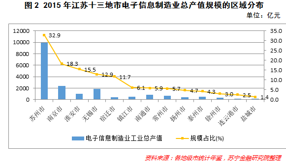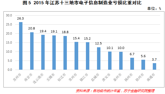 作为江苏省制造业的收入“状元”,电子信息制造业在省内十三地市之间的分布并不均匀。苏州规模以上企业主营收入高达9500亿元、占比高达53%,在一定程度上成为反映江苏电子信息制造业的“晴雨表”。遗憾的是,2015年,苏州有299家企业亏损、占全部企业规模以上1136家企业的26.3%,其亏损面占比在省内排名第一,带动江苏电子信息制造业整体发展相对滞后。