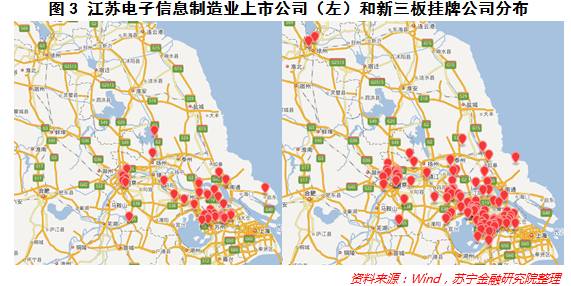 从各地级市公众公司的分布情况看,电子信息制造业新三板和沪深上市企业在江苏省内的分布更为集中(参见图3)。具体来说,苏南有32家沪深上市公司,苏中有5家,苏北则没有该产业的上市公司。新三板企业中,苏南有142家新三板企业,苏中有13家,苏北仅有4家。苏南五市中,苏州市公众公司的数量最多,共计21家沪深上市公司和48家新三板企业。
