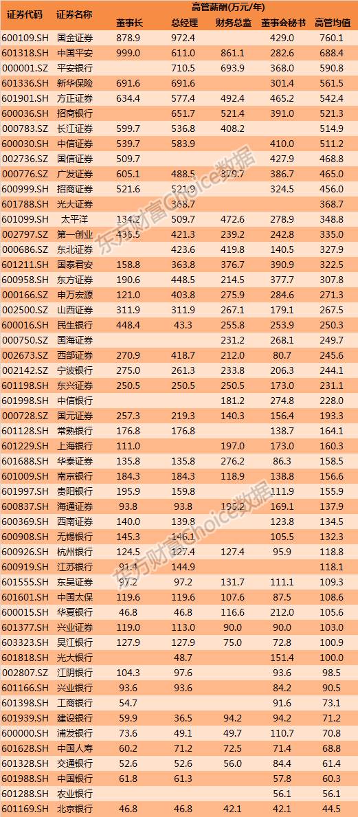 作为金融行业可以说最顶尖的人物,上市金融公司高管的薪资是很高很高的,根据2015年上市公司年度报告,52家金融上市公司的174个高管人员平均薪酬为250万元,最高年薪近千万元,最低的也有数十万,这也是很多金融人追求的方向。