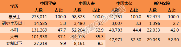 中国平安的研究生及以上学历人员占比5.3%高于其他三家保险公司的3%左右,从整体上看,保险行业的平均学历水平在本科附近。