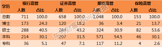 再看看金融业最顶尖的各高管,不论是银行、证券、期货、保险,90%的高管人员都是本科以上学历,其中银行和证券20%的高管具有博士学历,保险和期货高管的博士比例是13.7%和3.4%。相比而言期货公司的高管人员,学历水平要略低于银证保。