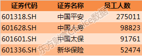 保险从业人员总数与银行业不相上下,在A股上市的四家保险公司中,中国平安的员工人数超过27万人,中国人寿和中国太保员工人数接近10万,新华保险的员工人数为5万人。