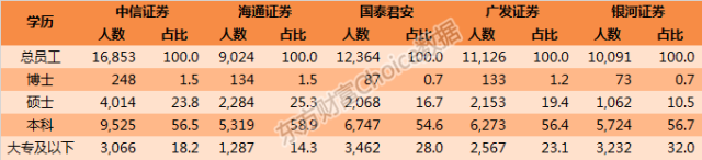 数据上可以明显的看出,证券行业的平均学历水平确实高于银行业,中信证券、海通证券、广发证券的博士人员占比超过1%,硕士及以上学历占比超过20%;国泰君安和银河证券相比而言平均学历稍弱于另外三家券商,大专及以下学历的人员占比在30%左右。