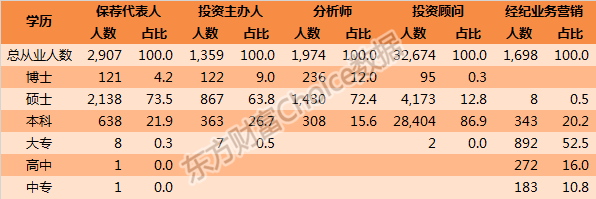在整体学历水平相对较高的证券行业,不同的岗位类型学历分布也有很大的区别,其中保荐代表人、投资主办人、分析师的基础学历可以说就是硕士,占比在80%左右。投资顾问的学历要求稍低,86.9%以上投资顾问都是本科学历,另外有12.8%的投资顾问是硕士研究生。证券经纪业务营销的学历要求是较低的,只有20%的人员有本科学历,50%为大专,27%的人员为高中或中专。