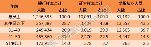 源源不断的年轻人涌入金融行业,30岁以下的金融人占比在30%以上,30岁、40岁、50岁的人也各有一席之地。50岁以上的人,在银行业占比相对较高,达到14%,证券和期货的从业人员中50岁以上人士占比仅为3%左右。这与各自岗位的性质也是息息相关的。