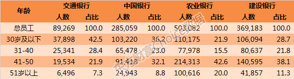 四个代表性的商业银行中,交通银行最年轻,30岁以下员工占比超过42%;中国银行和建设银行次之,6成的员工年龄在30-50岁之间;相较而言农业银行是几大行中平均年龄最大的,50岁以上人员占比达到了20%。