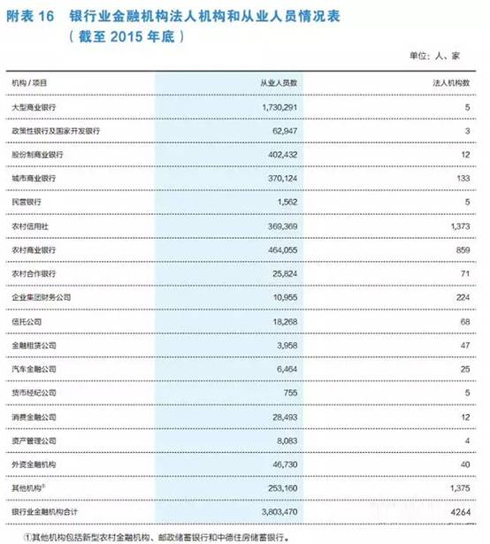 近期,银监会发布《中国银行业监督管理委员会2015年报》,数据显示:截至 2015 年底,我国银行业金融机构共有法人机构 4,262 家,从业人员 380 万人。